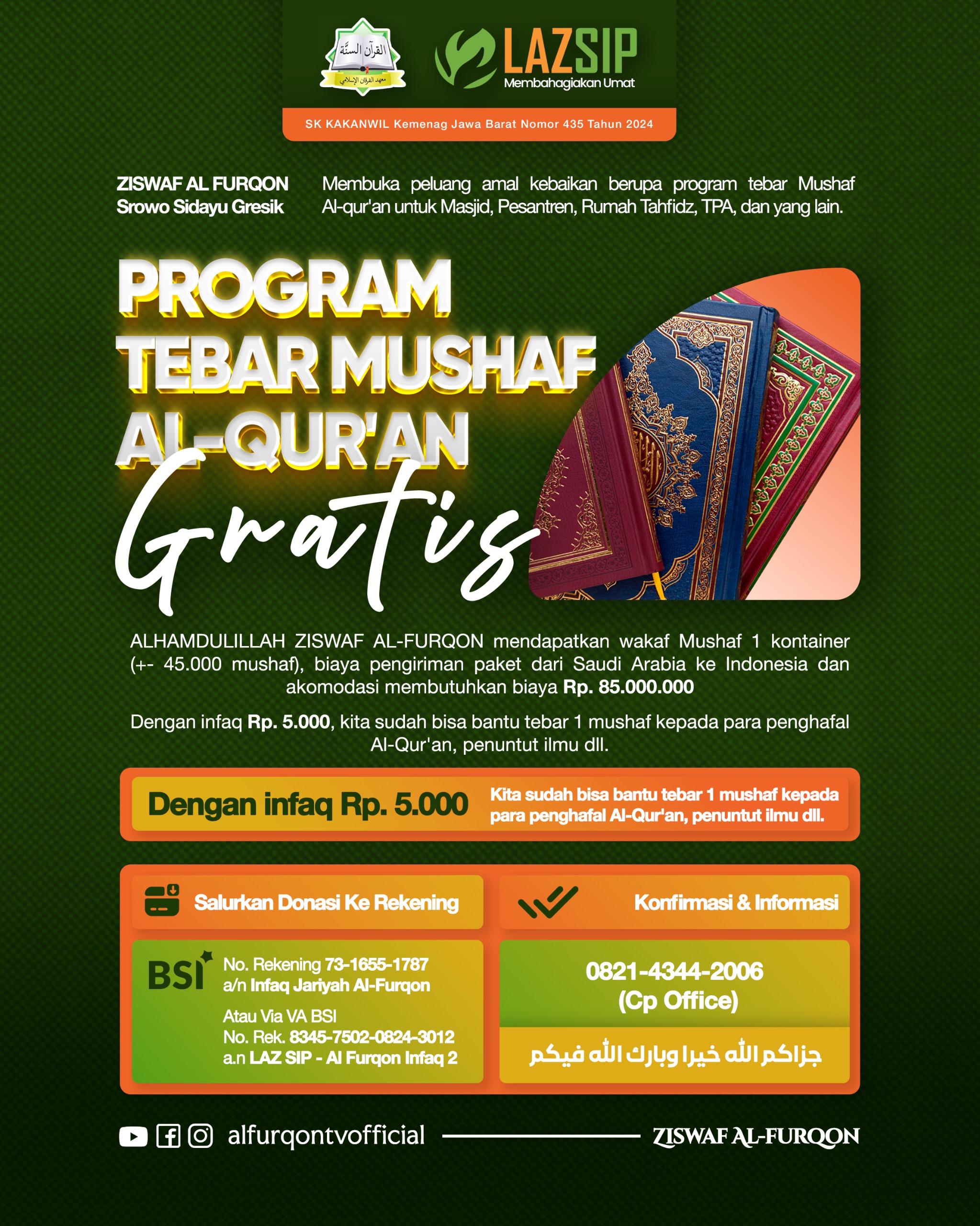 ZISWAF Al-FURQON adalah gabungan dari dua bidang yang berbeda yaitu BWF - Badan Wakaf Al-Furqon dan DAKSOS - Bidang Dakwah & Sosial Al-Furqon yang selanjutnya digabung menjadi satu bidang.